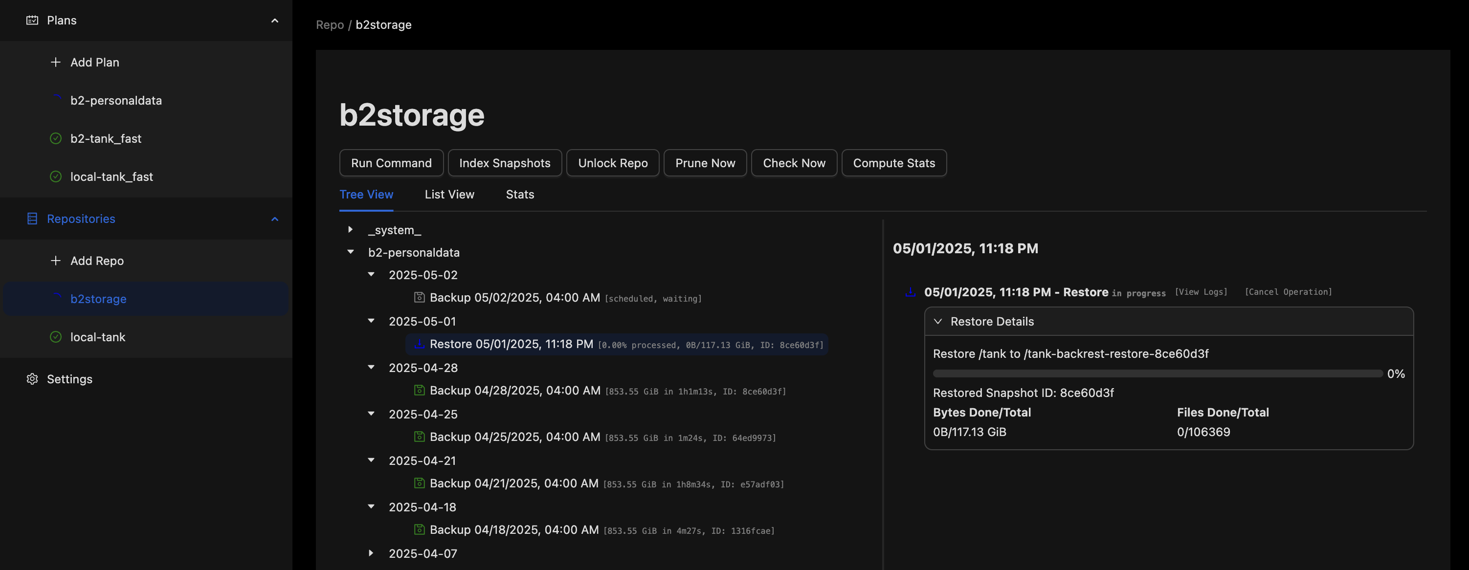 Once you have selected a location, click "Restore". Backrest will begin the restore process as a new operation visible at the top of the operation tree. You can monitor the progress of the restore in the operation tree.
